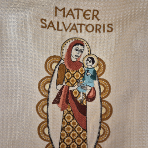 Wśród naszych szat liturgicznych znajduje się wyjątkowy ornat poświęcony Maryi, opatrzony tytułem Mater Salvatoris – Matka Zbawiciela. Jego bogata symbolika prowadzi nas przez biblijną genealogię Jezusa, ukazaną w formie drzewa rodowego wyrastającego od Adama aż po Maryję. To niezwykłe połączenie teologii, biblijnej historii i sztuki liturgicznej.